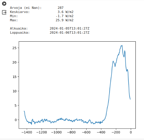 Python-ohjelma hakee Jyväskylän lentoaseman mittauspisteen tuloksista Auringon kokonaissäteilytehon viimeisen vuorokauden ajalta ja viiden minuutin mittausvälein. Tuloksista piirretään kuvaaja, jonka vaaka-akselilla on aika minuutteina tietojen lataamishetkestä ja pystyakselilla kokonaissäteilyteho.